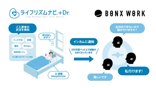 エコナビスタ株式会社(代表取締役社長:渡邉 君人、本社:東京都千代田区、以下「エコナビスタ」)が睡眠解析技術をベースに開発した、SaaS型高齢者見守りシステムのトップランナー※1のサービス「ライフリズムナビ+Dr.」と、株式会社BONX(代表取締役:宮坂 貴大、本社:東京都中央区、以下「BONX」)が展開する現場コミュニケーションのワンストップソリューション「BONX WORK(ボンクス・ワーク)」(以下、「BONX WORK」)と機能連携しましたのでお知らせいたします。