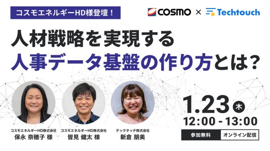 企業の競争力向上のための人材戦略の重要性の高まりを受け、人事データの活用が必要不可欠となるなか、人事データの基盤構築や収集、有効活用に課題を抱える企業も少なくありません。人事システムの活用支援においても多数の実績を持つテックタッチが、HRテックを活用した人材戦略に積極的に取り組まれているコスモエネルギーHD様をお招きし、人事データ利活用のノウハウを伝えたいという思いから開催に至りました。
