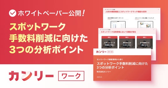 即戦力人材のデータベース蓄積およびスポットワーク活用を支援する『カンリーワーク』の開発・提供を行う株式会社カンリー(所在地:東京都品川区、代表取締役:辰巳 衛, 秋山 祐太朗、以下カンリー)は、2025年1月17日(金)に、ホワイトペーパー「カンリーワーク顧客事例から導く、スポットワーク手数料削減に向けた3つの分析ポイント」の無料ダウンロードを開始しました。