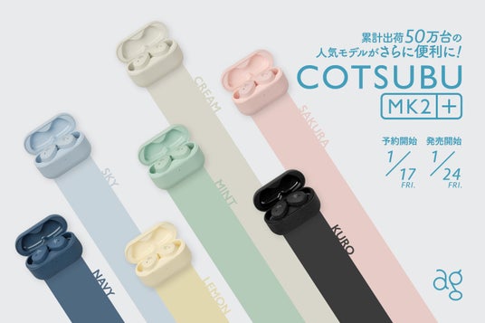 国内オーディオメーカー株式会社final(代表:細尾 満、本社:神奈川県川崎市)は、agブランドの人気ワイヤレスイヤホン「COTSUBU MK2」に、複数の機器に接続できる「マルチポイント」機能を追加した「COTSUBU MK2+(コツブ エムケーツー プラス)」(各 6,980円)を本日2025年1月17日(金)より予約開始、2025年1月24日(金)より発売いたします。