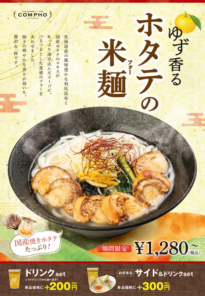 フォー専門店「COMPHO」で、期間限定で「ゆず香るホタテの米麺(フォー)」を提供中です。