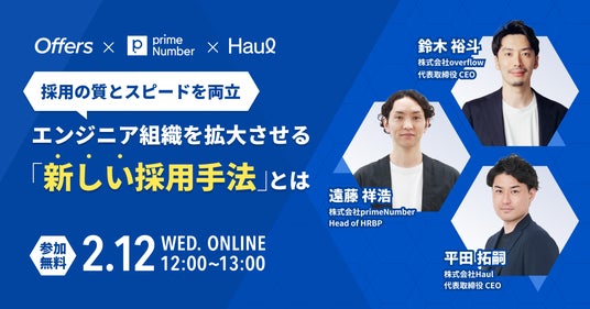 2025年2月12日(水) 12:00~13:00 に、株式会社overflow 代表取締役 CEO 鈴木裕斗氏と株式会社primeNumber Head of HRBP 遠藤 祥浩氏をお招きし、「採用の質とスピードを両立させるエンジニア採用の新しい手法」についてのウェビナーを開催します。