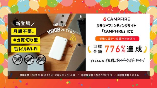 約1ヶ月で目標776%達成クラウドファンディング「サクッとWi-Fi」先行販売終了