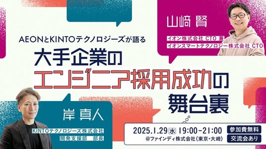 「はたらいて、笑おう。」をビジョンに掲げるパーソルグループのパーソルイノベーション株式会社 TECH PLAY Company(本社:東京都港区、TECH PLAY Company代表:片岡 秀夫)が運営する、27万人の会員をもつテクノロジー人材のエンパワーメントと企業のDX組織構築の支援サービスを提供する『TECH PLAY(テック プレイ)』※とファインディ株式会社は、2025年1月29日(水)19:00より、AEON株式会社とKINTOテクノロジーズ株式会社をゲストに迎え、「大手企業のエンジニア採用成功の舞台裏」と題したオフラインセミナーを開催します。当日は、イベント後に交流会も開催予定です。