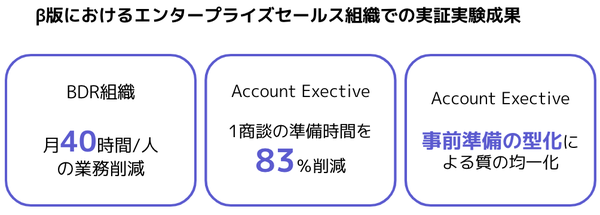 同社では「Sales Retriever」β版での実証実験を複数の企業におけるエンタープライズセールス組織にて行い、その結果、複数社にて業務改善効果を実現したため、この度正式版の提供に至ったとしている。