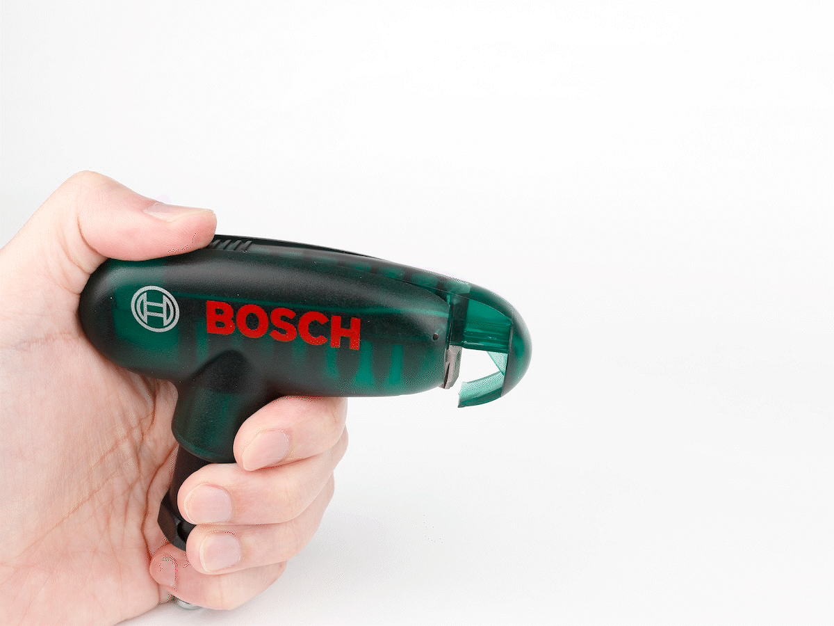 取り出し方は簡単。上部の滑り止め部分に指をかけてカチャッとスライドし、そのまま引き出します。後はクルッと回せば、ビットホルダーが露出するという仕組みです。引き出すときにホルダーごと抜けてしまうのではと心配になりますが、ちゃんとストッパーがあるので大丈夫。