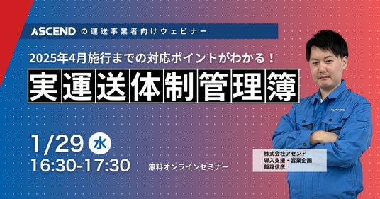 物流DXを推進するアセンド株式会社(本社:東京都新宿区、代表取締役:日下瑞貴、以下「当社」)は、2025年4月より運用が義務付けられている「実運送体制管理簿」の作成等に関して、1月29日(水)に無料のオンラインセミナーを開催することをお知らせいたします。