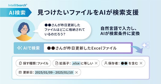 どのようなファイルを探しているのかを自然言語で入力するだけで、AIが検索条件を生成します。例えば「Aさんが先週更新したExcelファイル」と入力すると拡張子、保存者名、更新日をAIが自動で検索条件に設定し検索結果が表示されます。