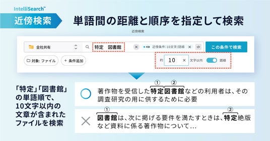 2つ以上のキーワード(スペース区切)を入力した場合に、あいだの文字数と語順を検索条件として指定でき、より精度の高い検索ができます。
