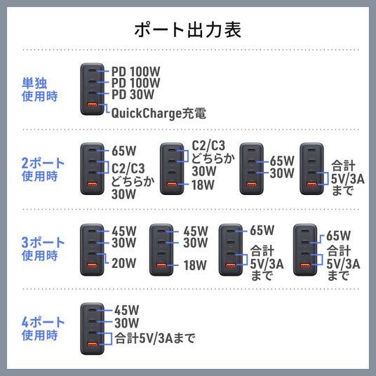 ポートの使用状況に応じて出力の電力配分を自動で切替えるため、ポートの出力を気にすることなく効率良く安全にご使用いただけます。