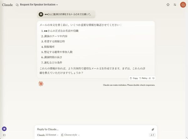Claudeにも聞いたら、文章を生成する前に、講演のテーマや開催日時、謝礼などの条件を逆に聞き返してきた。つまり、これらの情報がなければきちんとした文章を作成できない、ということだ。