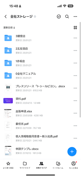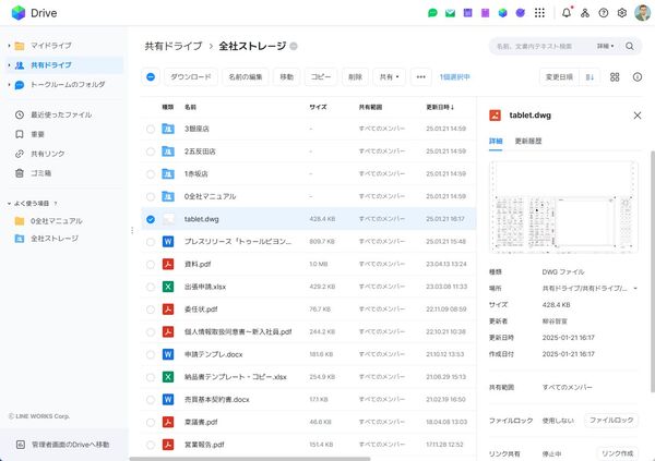 「Drive」はLINE WORKSのストレージとして利用でき、トークやノート、掲示板などと連携し、ファイルの保存や共有ができる。もちろん、PCだけでなく、モバイルアプリからでもアクセス可能だ。