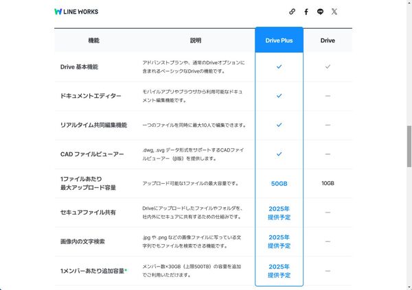 2025年1月21日、「LINE WORKS」のクラウドストレージ「Drive」機能を拡張する「Drive Plusオプション」の提供が開始された。共同作業を安全かつ効率的に支援する機能を備えているのが特徴。「LINE WORKS」の有料プラン向けのサービスで、「Drive Plusオプション」の価格はスタンダードプランの場合は月額500円/1ユーザー(年額契約)、アドバンストプランの場合は月額400円/1ユーザー(年額契約)となる。