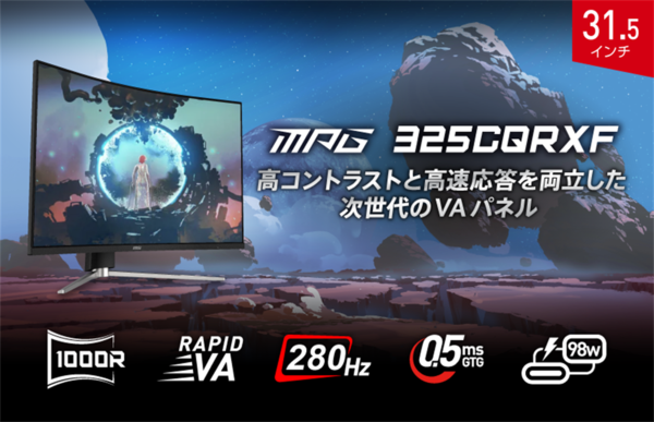一方、MPG 325CQRXFは1,000Rの湾曲パネルで高い没入感を提供し、31.5インチWQHD(2,560 × 1,440)の解像度を持つ。このモデルは280Hzのリフレッシュレートと0.5ms(GTG)の応答速度を誇り、高速な動きにも対応可能だ。また、KVMスイッチやUSB Power Delivery 98Wなど、利便性を高める機能も充実している。