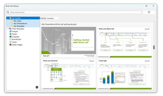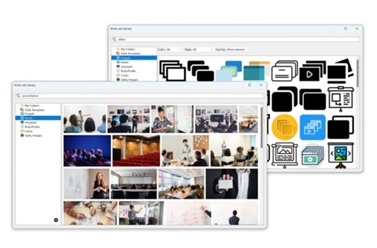 think-cellライブラリ:スライド、テンプレート、画像素材などビジネス資料作成に必要なコンテンツをパワポ内で検索することが可能になります。検索結果で表示された素材をそのままパワポスライドにワンクリックで挿入することが可能です。素材をスライドに挿入する際、元のデータの場所は変わりません。クラウドにアップロードすることなく、別の場所にコピーすることもありません。