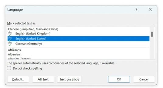 ・選択したオブジェクト、スライド、プレゼンテーションごとに校正する言語を選択することが可