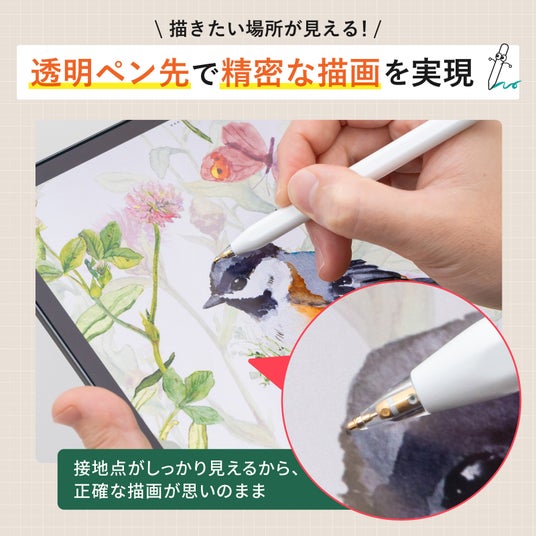 透明なペン先デザインにより、ペンと画面の接地点がはっきり見え、正確な操作が可能です。