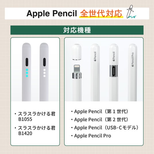 対応機種:Apple Pencil(第1世代)/Apple Pencil(第2世代)/Apple Pencil(USB-Cモデル)/Apple Pencil Pro/スラスラかける君 B1055/スラスラかける君 B1420