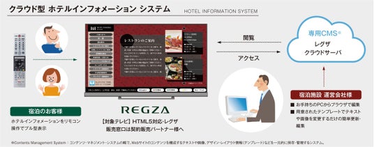 ホテル館内の情報発信に特化した、ホテル客室インフォメーションシステムです。本サービスは、表示するコンテンツを、レグザが提供するコンテンツマネジメントシステムを利用してホテル関係者が作成・運用でき、必要な情報を宿泊者に素早く安価に提供することが可能です。