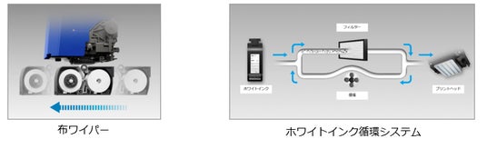 自動メンテナンス機能が充実しているため、Direct to Film(DTF)専用プリンターで必要だった毎日のメンテナンス作業が不要です。プリントヘッドを清潔に保つために必要な「吸引キャップ」には自動クリーニング機能を搭載。またロール式の布製ワイパーを搭載し、常に新しい布でプリントヘッドを拭きとるため、毎日の部品清掃が不要となります。さらに、ホワイトインクの自動循環システムでインク詰まりを防ぐなど、充実した自動メンテナンス機能により、メンテナンス工数を大幅削減しながら安定稼働を実現します。