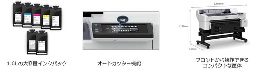 使いやすさを考慮し、インク交換回数を抑える1.6Lの大容量インクパックや、パネルで操作する便利なオートカッター機能を搭載しました。また、コンパクトな筐体に加え、前面給紙・排紙のフロントオペレーションでプリンターの背面にスペースをとる必要がないため、作業スペースを広く確保することができます。
