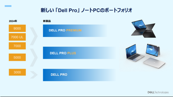 製品カテゴリーは「Dell」、「Dell Pro」、「Dell Pro Max」となり、ノートPCでは、それぞれ「無印」(Base)、「Plus」、「Premium」の3ラインを持ち、合計で9シリーズとなる。