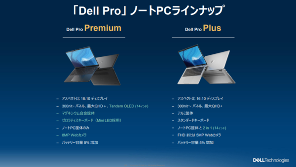 Dell Pro 14/16 Plusは、ビジネス向け主力ノートPCとして、あらゆる仕事のニーズに対応できるとするCopilot+ PC(Dell Pro 13 Plusの販売については未定)。Plusは、Latitudeの7000/5000あたりに相当するモデルだということだ。