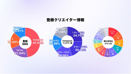 「HYPE CAST AI」は、Instagramを中心に、中規模(3万人)以上のフォロワー基盤を持つクリエイターが多いだけでなく、TikTokやXなど、複数のプラットフォームで活躍するクリエイターが存在しており、ビューティーやファッションのみならず、飲食・小売ジャンルへもマッチングを拡大し、多様な広告ニーズに対応可能です。