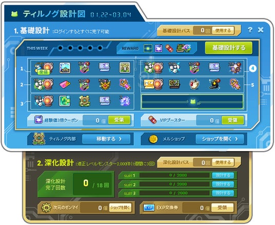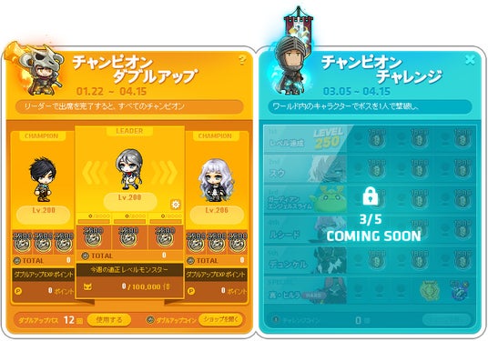 - ダブルアップ出席リーダーで適正レベルモンスターを2,000体退治すると、「ダブルアップコイン」2,500個が3体のチャンピオンそれぞれに付与されます(合計7,500個)。集めたダブルアップコインは、専用のコインショップで、キャラクターの強化や成長に役立つ様々な報酬アイテムと交換することができます。