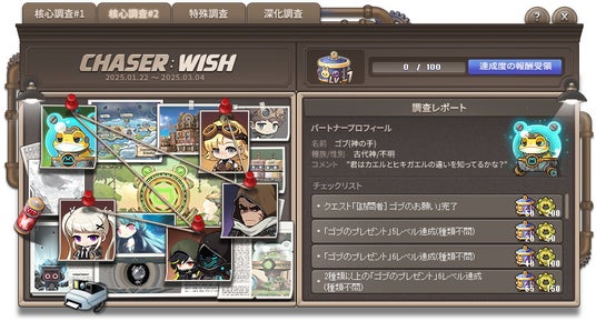 CHASERイベントは後半戦に突入!本日からスタートした「核心調査#2」で、登場するキャラクターたちの調査を進めましょう。イベントUIでキャラクターの写真をクリックすると、各キャラクターのミッションが確認できます。ミッションを達成すると、各ミッションに応じた「CHASER調査進捗度」と、「次元のゼンマイ」が獲得できます。