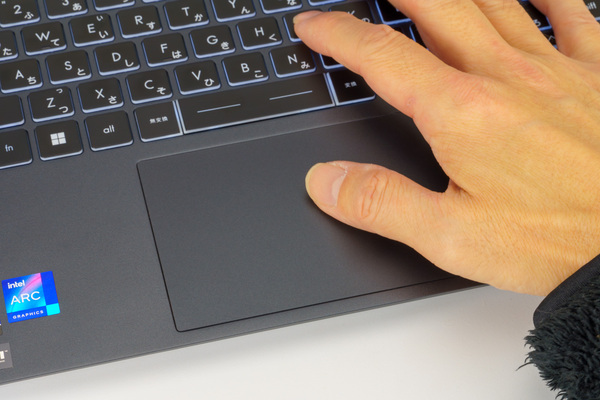 キーボードは一部のキーが密着しているが、ほぼフルキー仕様で、バックライトも備えているため暗い場所での作業も快適。タッチパッドは非常に広く、滑らかなタッチ感で親指でもサクサクと操作できる。