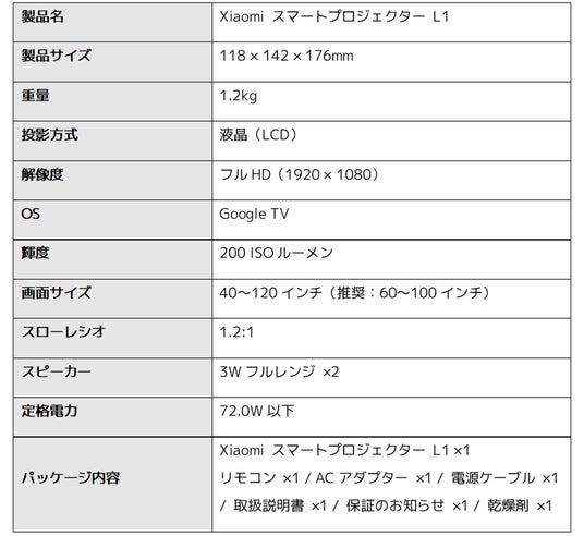 ■「Xiaomi スマートプロジェクター L1」の製品特長