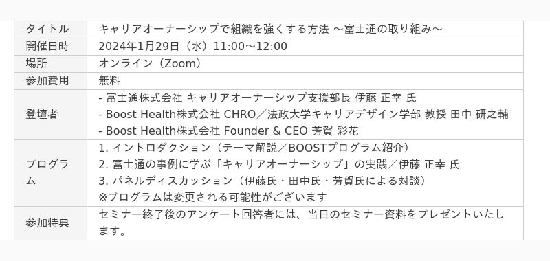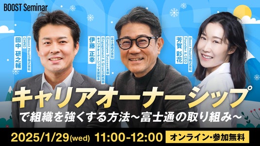 Boost Health株式会社(代表取締役CEO:芳賀 彩花)は、2024年1月29日(水)に、組織と個人の成長を加速させるオンラインセミナー「BOOST Seminar」を開催いたします。本セミナーでは、12万人以上の社員を擁する富士通株式会社が進める「キャリアオーナーシップ」推進事例を取り上げ、社員のウェルビーイングを高めながら組織パフォーマンスを向上させる秘訣を紐解きます。