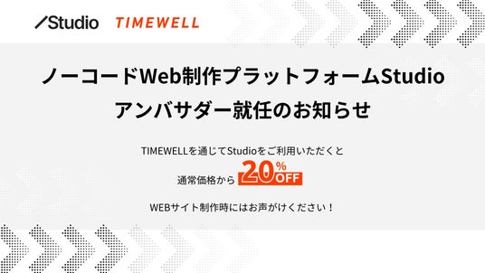 株式会社TIMEWELL(本社:神奈川県横浜市、代表取締役:濱本隆太、以下TIMEWELL)は、ノーコードWeb制作プラットフォーム「Studio」のアンバサダーに就任したことをお知らせいたします。TIMEWELLを通じてStudioをご利用いただくと通常価格から20%オフになりますので、WEBサイト制作時にはお声がけください。