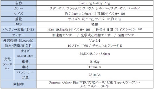 ※17バッテリー駆動時間はサイズによって異なります。定格容量は「Samsung Galaxy Ring」のサイズ5~7で約18mAh(一度の充電でバッテリー駆動時間は最大6日間)です。また使用パターン、使用環境などによって異なる場合があります。