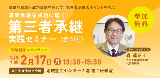 本セミナーでは、事業の第三者承継(親族や従業員以外へ承継すること)に焦点を当て、そのプロセスや事例などをご紹介いたします。また、専門家視点での事業承継に関する基調講演の他、実際に第三者承継をされた方をお招きしたトークセッションも行います。