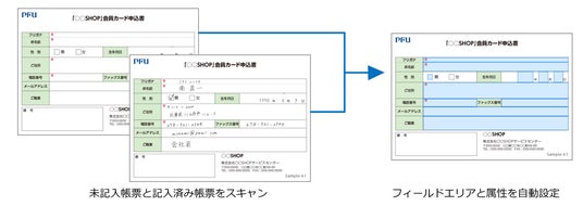 「PaperStream Capture Pro」では、未記入帳票と記入済み帳票をスキャンすると、記入された文字と罫線・下線の情報をもとにOCR対象となるフィールドを自動的に検出します。さらに、各フィールドに対して、文字種別や言語など属性を自動的に設定します。フィールドを1項目ずつ手作業で設定していく手間がなく、新しいレイアウトの帳票が発生した場合も、すぐにOCRを適用できます。