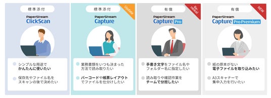 今般のリニューアルに伴い、ライセンス形態が買い切り型から1年ごとの契約制へと切り替わります。初期導入費用を抑えることができるため、特定の業務用途や短期的に利用したいお客様をはじめ、少人数で高い成果を上げる必要のある中小企業においても導入しやすい製品となりました。新機能を搭載しパワーアップした「PaperStream」シリーズが、より一層の業務効率化をサポートします。