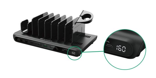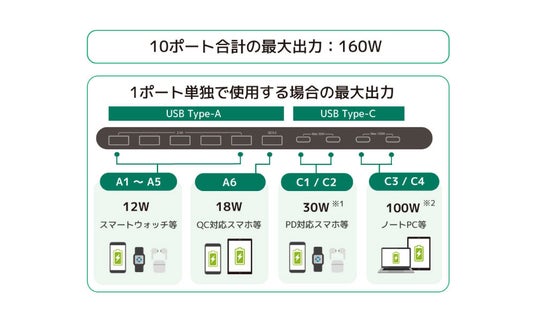 10ポート合計の最大出力は160W。 USB Type-Aは1ポートあたり最大18W、USB Type-Cは1ポートあたり最大100Wに対応しています。