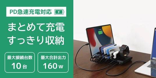 10ポート合計の最大出力は160W。一部ポートはPD-PPSに対応しており、急速充電(PD)や、機器の発熱を抑えた効率的な充電が可能です。