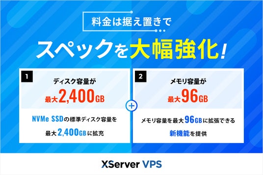 エックスサーバー株式会社(所在地:大阪市北区、代表取締役:小林 尚希)は、サーバー性能とコストパフォーマンスでNo.1(※1)を誇る『XServer VPS』の提供スペックを大幅に強化することを決定しました。適用は2025年2月上旬を予定しています。今回の強化では、4GBプラン以上で一律100GBだったNVMe SSDのディスク容量を最大2,400GBまで拡大。さらに8GBプラン以上では、メモリ容量を無料で1.5倍に増設できる機能を新たに追加します。