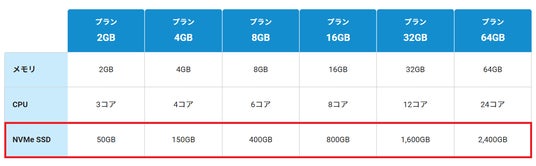 従来は4GB~64GBのプランにおいて、一律100GBの容量を提供していましたが、今回の強化によりディスク容量を最大2,400GBまで拡大します。