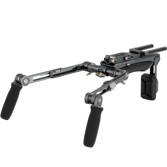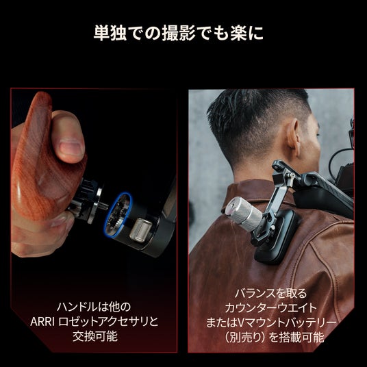 さらに、ハンドルは取り外し可能で、他のARRIロゼットアクセサリーと交換可能です。バランス調整用のカウンターウェイトやVマウントバッテリー(別売り)を搭載することができます。