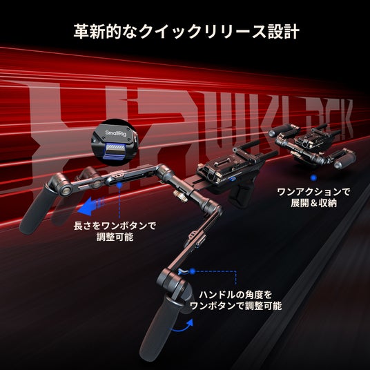 HawkLock ショルダーリグ SR007 Pro は、革新的なクイックリリース設計を採用しており、数秒で展開と収納が可能です。また、長さやハンドルの角度もワンボタンで簡単に調整できるため、セットアップの効率が大幅に向上します。