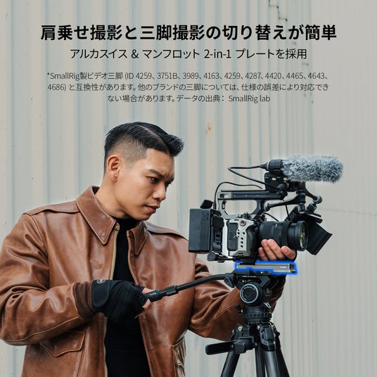また、クイックリリースプレートにより前後の調整が簡単になり、素早くバランスを取ることができます。アルカスイスおよびマンフロット 2-in-1 プレートを採用しており、肩乗せ撮影と三脚撮影の切り替えが簡単に行えます。