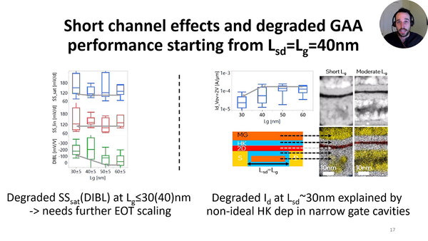 右側は2Vでのオーバードライブ駆動時の駆動電流を比較したもので、Lgを30nmにすると顕著に電流が劣化する。これはチャネルの形状が劣化することで、不十分な構成のGAAが形成されてしまい、GAAの利点が失われてしまうためで、これに関してさらなる最適化が必要、としている。