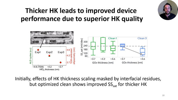 これは酸化膜の界面に残留した炭素汚染がEOTスケーリングを妨げたためと判断されており、逆に今回のClean 3では特に4.6nmにするとSSsatが明確に改善したが、3.7nm厚ではその改善効果が減少するとしている。Clean 1と比較して最適化が進んだClean 3でもこの限界がみられるというのは、GAA NMOSトランジスタの新たな限界要因になり得ることを示している