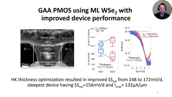一般論としてWSe2を利用したPMOSは、同じ構成のNMOSに劣っている。これは材料の接触抵抗と潜在的な欠陥の増加が主な課題とされている。これに対する研究の1つとして、蒸着Ru(ルビジウム)を利用したコンタクトは、Au(金)のコンタクトよりIdmaxを向上させられるという話が2023年のIEDMで発表されている。