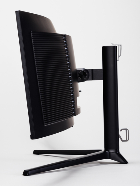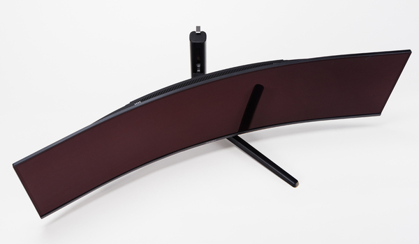 パネルは光沢のあるタイプで、曲率R1800のいわゆる湾曲ディスプレー。高さは568mmほどだが、横幅1200mmと、かなり横長いモデルとなっている。全体は黒一色で落ち着いた雰囲気だが、背面のスタンド接合部を挟んだ左右にはLEDが配され、レインボーに点灯することでゲーミングの高揚感を醸し出している。