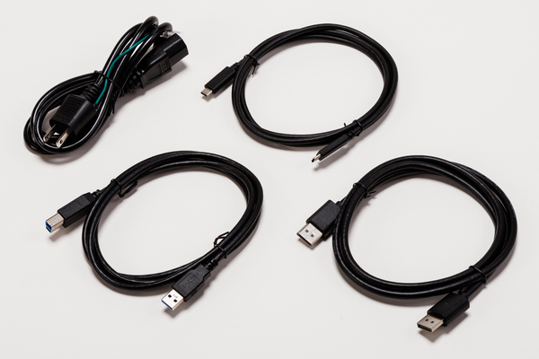 付属品は、電源ケーブルのほか、DisplayPortとUSB Type-Cケーブル、それにUSB Type-B-Type-A変換ケーブルが1本ずつと充実している。いずれのケーブルとも長さは約1.5mだ。